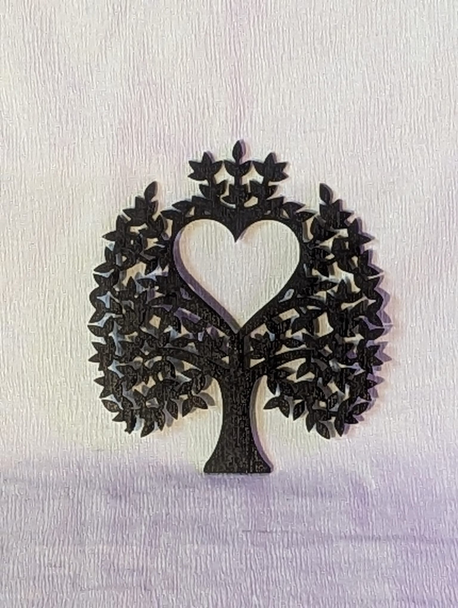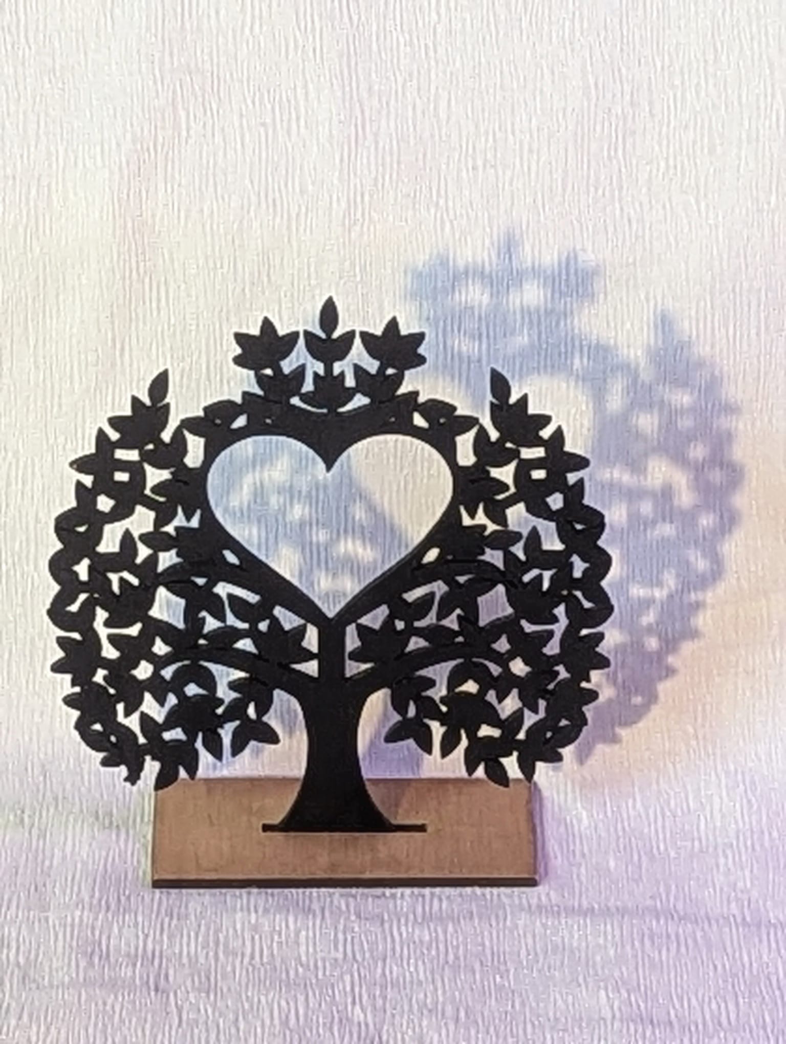 Compact houten figuur van een boom met hart, zwart afgewerkt en uitgesneden uit biologisch multiplex hout.