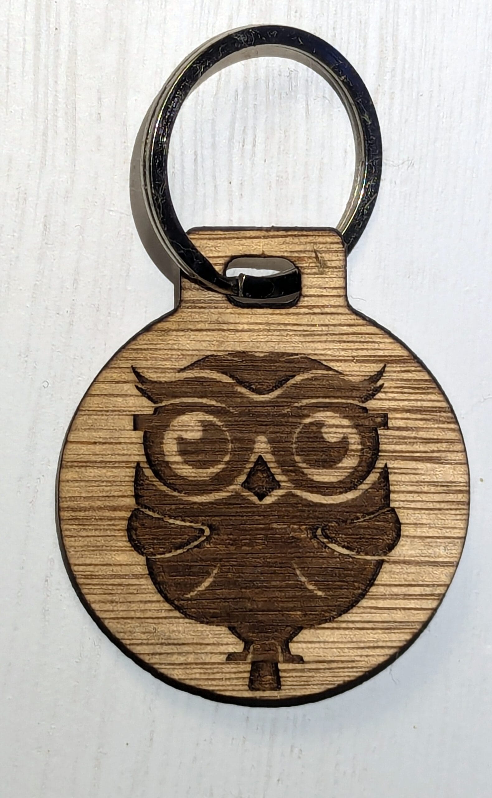 Houten sleutelhanger met ingegraveerde zittende uil.